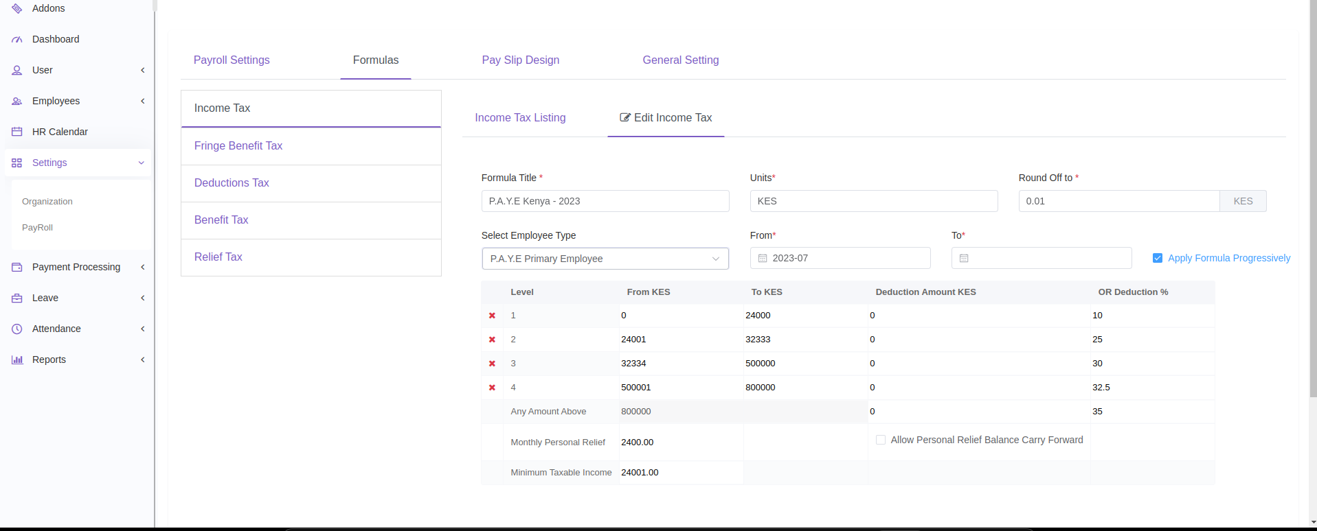 Zuri HR gives you full control over how different types of taxes and reliefs are calculated. Through Formula Settings, you can customize tax formulas for income, fringe benefits, deductions, and more—ensuring your payroll aligns with regulatory and company policies.