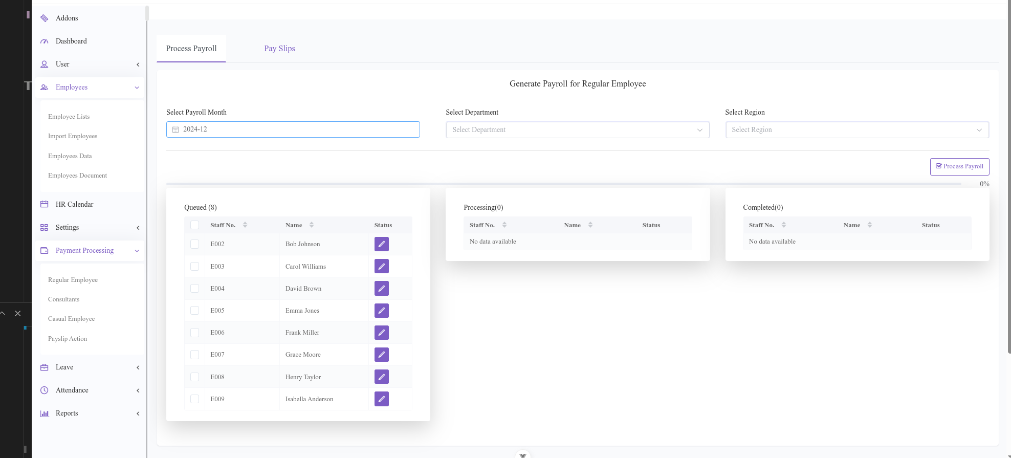 Processing occurs in the background - you can perform other tasks while this process is running. Another quick way to achieve this is to click the "Process Payroll" button on the system dashboard.